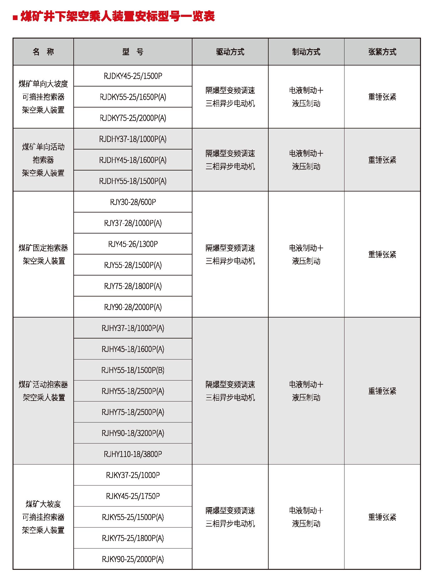 煤礦井下架空乘人裝置安標(biāo)型號(hào)一覽表